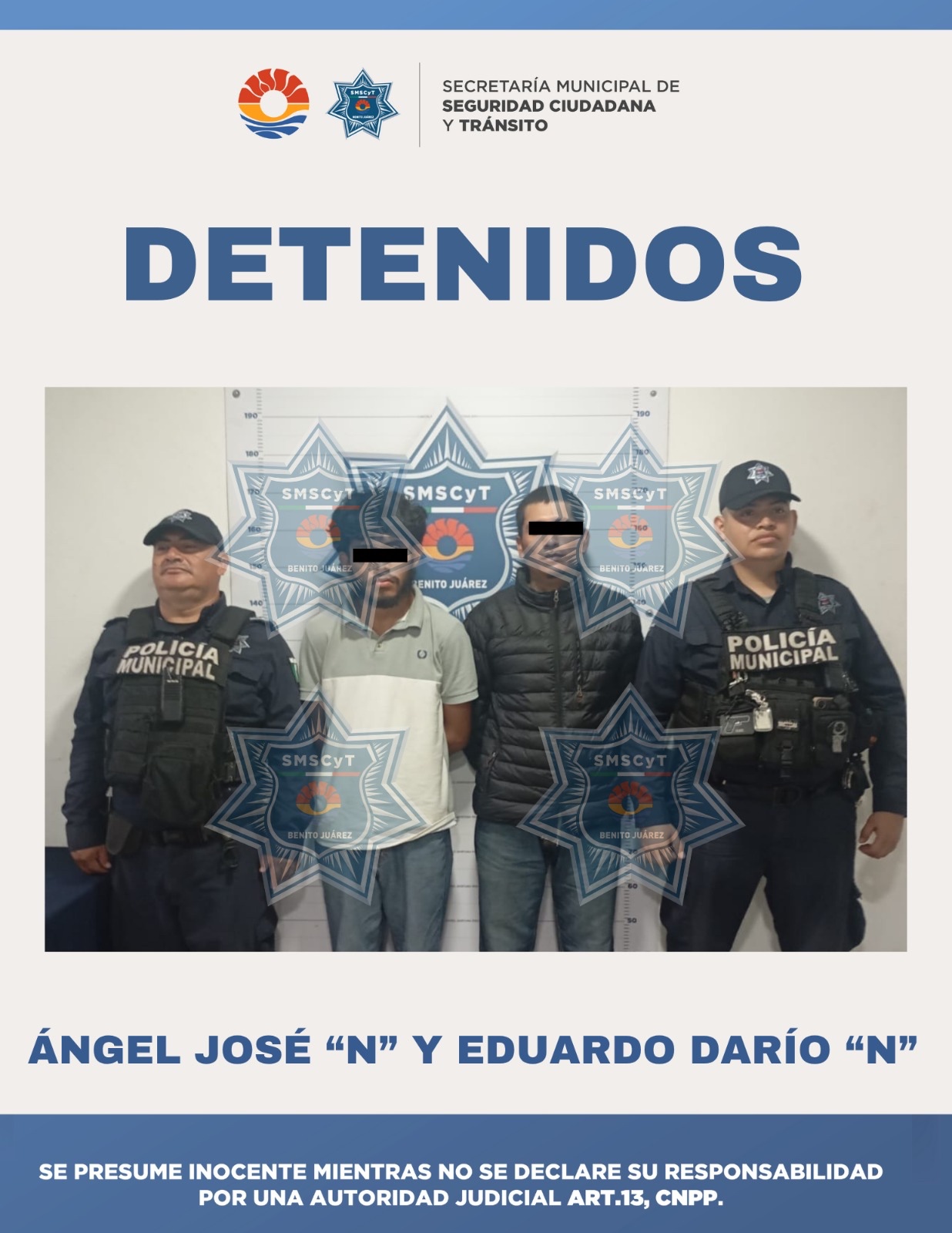13 DE OCTUBRE DEL 2025 – LOCAL. Elementos de la Secretaría Municipal de Seguridad Ciudadana y Tránsito (SMSCyT) de Cancún lograron la detención de dos sujetos en un hecho que inició como una simple alteración del orden público y escaló hasta la agresión a la autoridad. Los detenidos, identificados como José Ángel “N” y Darío Eduardo “N”, fueron puestos a disposición de las autoridades ministeriales por los presuntos delitos de desobediencia y resistencia de particulares, después de enfrentar a los policías que intentaron calmarlos. La acción de los oficiales se da en el marco de los operativos de vigilancia para garantizar la tranquilidad de los ciudadanos en las diferentes Supermanzanas de la ciudad.