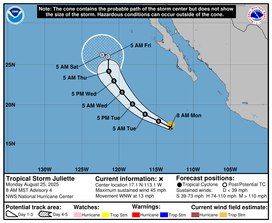 La tormenta tropical Juliette se ha formado en las aguas del océano Pacífico y avanza en dirección oeste-noroeste, manteniéndose lejos de las costas. Según el Centro Nacional de Huracanes (NHC), este ciclón, que lleva el décimo nombre de la temporada, se encuentra a unos 705 kilómetros al sur-suroeste del extremo sur de Baja California. Con vientos sostenidos de 65 km/h, la tormenta se desplaza a una velocidad de 20 km/h, lo que permite a las autoridades monitorear su evolución sin que represente una amenaza inmediata para la población.