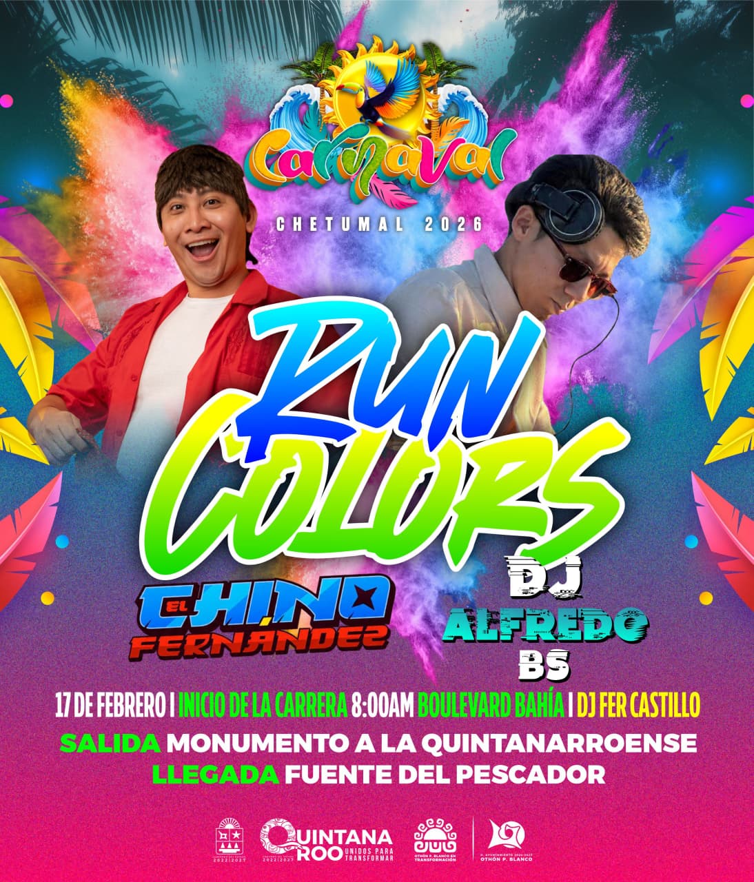 La diversión no se detiene y continuará el martes 17 de febrero desde muy temprano con actividades deportivas y recreativas. A las 8:00 de la mañana iniciará la gran carrera «Run Colors», partiendo desde el Monumento a la Mujer Quintanarroense. Esta actividad, que forma parte de la Fiesta del Carnaval Chetumal 2026, tendrá su meta en la Fuente del Pescador. En ese punto, los corredores y el público en general podrán disfrutar de un show lleno de energía a cargo del DJ Alfredo BS, quien tendrá como invitado especial al popular «Chino Fernández».