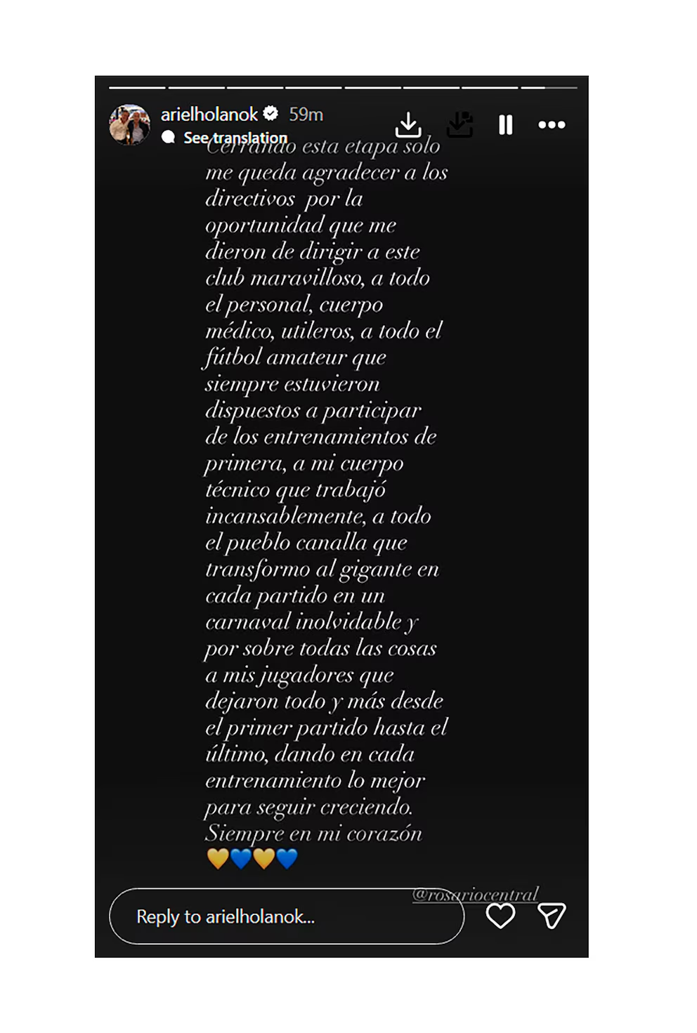 El entrenador de 65 años utilizó sus redes sociales para romper el silencio y despedirse formalmente de la institución que le abrió las puertas durante este último año. En su cuenta de Instagram, Ariel Holan publicó un texto muy sentido donde agradeció profundamente a los directivos, al cuerpo médico, a los utileros y a todo el personal del fútbol amateur. Destacó especialmente el trabajo incansable de su cuerpo técnico y la gran predisposición de todos los empleados del club para ayudar en los entrenamientos diarios, mostrando que se va con una sensación de gratitud hacia quienes lo acompañaron en el día a día del predio de Arroyo Seco.