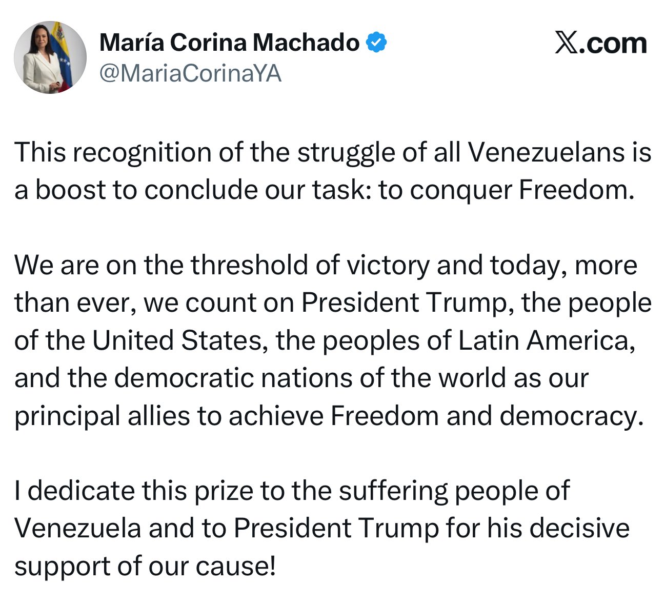 La ganadora del Nobel de la Paz hizo un llamado explícito a sus aliados internacionales, señalando que la Libertad está al alcance: «Estamos en el umbral de la victoria y hoy, más que nunca, contamos con el presidente Trump, el pueblo de Estados Unidos, los pueblos de América Latina y las naciones democráticas del mundo como nuestros principales aliados para lograr la libertad y la democracia«. Esta mención coloca a Trump, a quien muchos ven como un líder polarizador, al mismo nivel de apoyo que el «pueblo de Estados Unidos» y las «naciones democráticas».