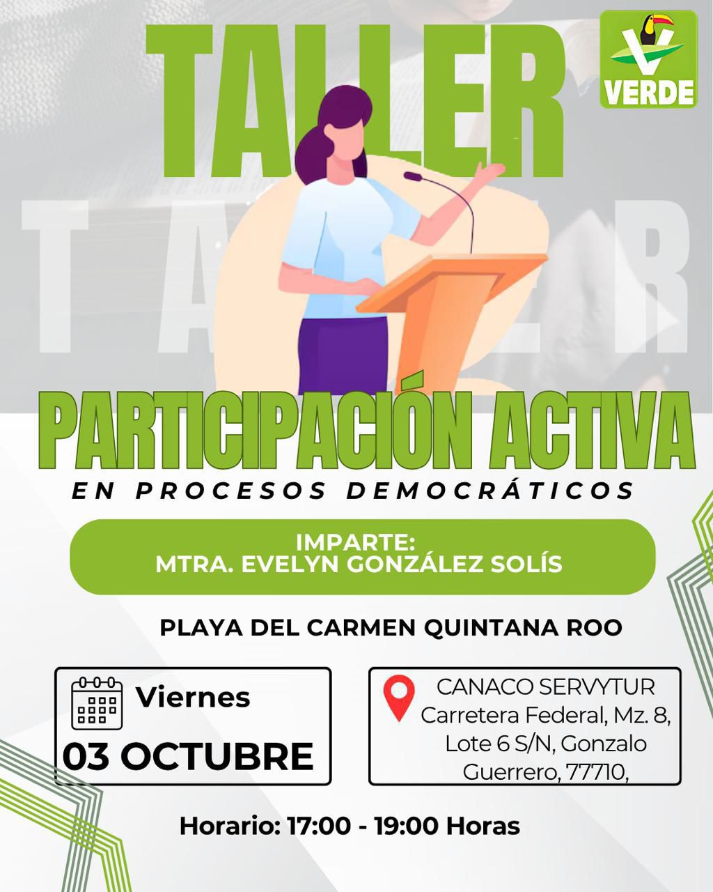 El taller, titulado «Participación Activa en Procesos Democráticos”, se llevará a cabo el próximo viernes 3 de octubre a las 17:00 horas. La sede elegida es un punto accesible en Playa del Carmen, específicamente en las instalaciones de la Cámara Nacional de Comercio, Servicios y Turismo (Canaco Servytur), ubicadas en la colonia Gonzalo Guerrero.