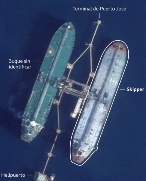 Los datos satelitales confirman que el petrolero falsificaba sus movimientos. Mientras que la última posición reportada por el AIS fue cerca de Guyana el 7 de noviembre, imágenes satelitales verificadas por BBC Verify mostraron que el Skipper estuvo en Puerto José, Venezuela, el 18 de noviembre, sin aparecer en los portales de seguimiento público. Los analistas de Kpler estimaron que el buque cargó «al menos 1,1 millones de barriles de crudo Merey» en esa terminal, con un destino declarado a Cuba.