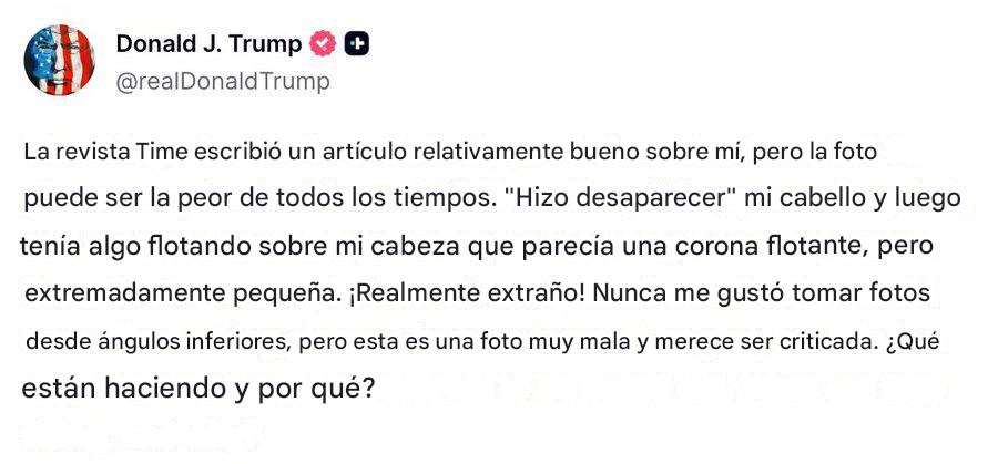 El presidente Trump manifest贸 p煤blicamente su indignaci贸n por la fotograf铆a utilizada por Time. Describi贸 que la imagen le hac铆a parecer que ten铆a una 芦corona flotante diminuta禄 sobre su cabeza, una percepci贸n que, a su juicio, desmerec铆a la seriedad y el alcance de lo que la revista misma hab铆a calificado como un triunfo hist贸rico. Este tipo de incidentes visuales, aunque parezcan menores, a menudo se magnifican en el 谩mbito de la pol铆tica de alto nivel, donde la imagen es fundamental.