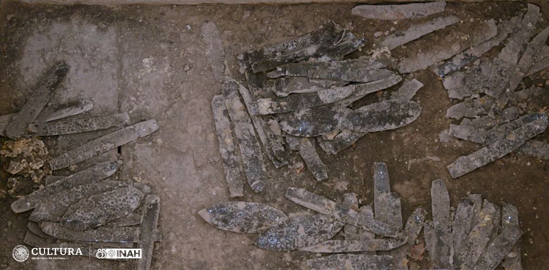 A unos dos metros con 80 centímetros de profundidad, al interior de la caja de ofrenda, los arqueólogos del INAH encontraron 59 navajillas de entre 10 y 15 centímetros de largo, siete cuchillos de obsidiana de una longitud similar, así como tres bloques de copal.