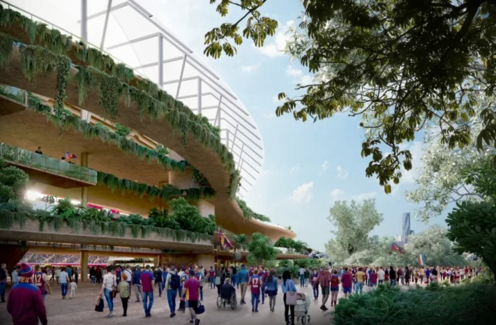 El diseño del estadio Brisbane 2032 está inspirado en las tradicionales casas “Queenslander”, un estilo arquitectónico típico del estado que destaca por sus terrazas y estructuras elevadas. Las imágenes digitales presentadas muestran una plataforma transitable alrededor del recinto, pensada para integrarse visualmente con el entorno urbano y natural del Parque Victoria, al norte del centro de la ciudad.