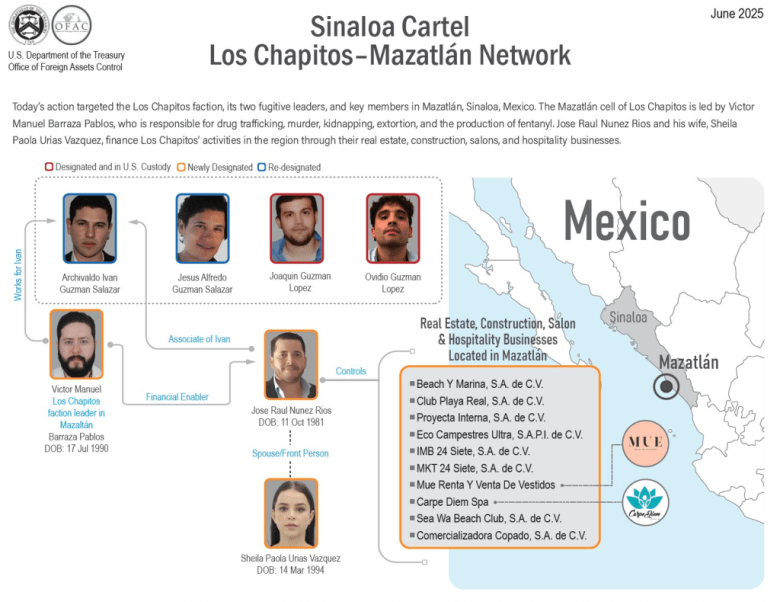 La OFAC también sancionó una red regional de socios y empresas de Los Chapitos, con sede en Mazatlán, Sinaloa (México), dedicada al narcotráfico, la extorsión, el secuestro y el lavado de dinero.