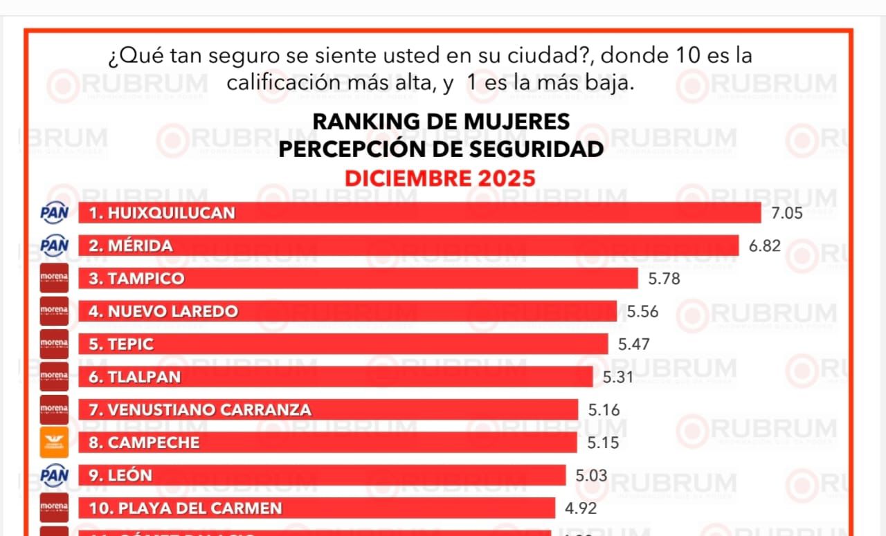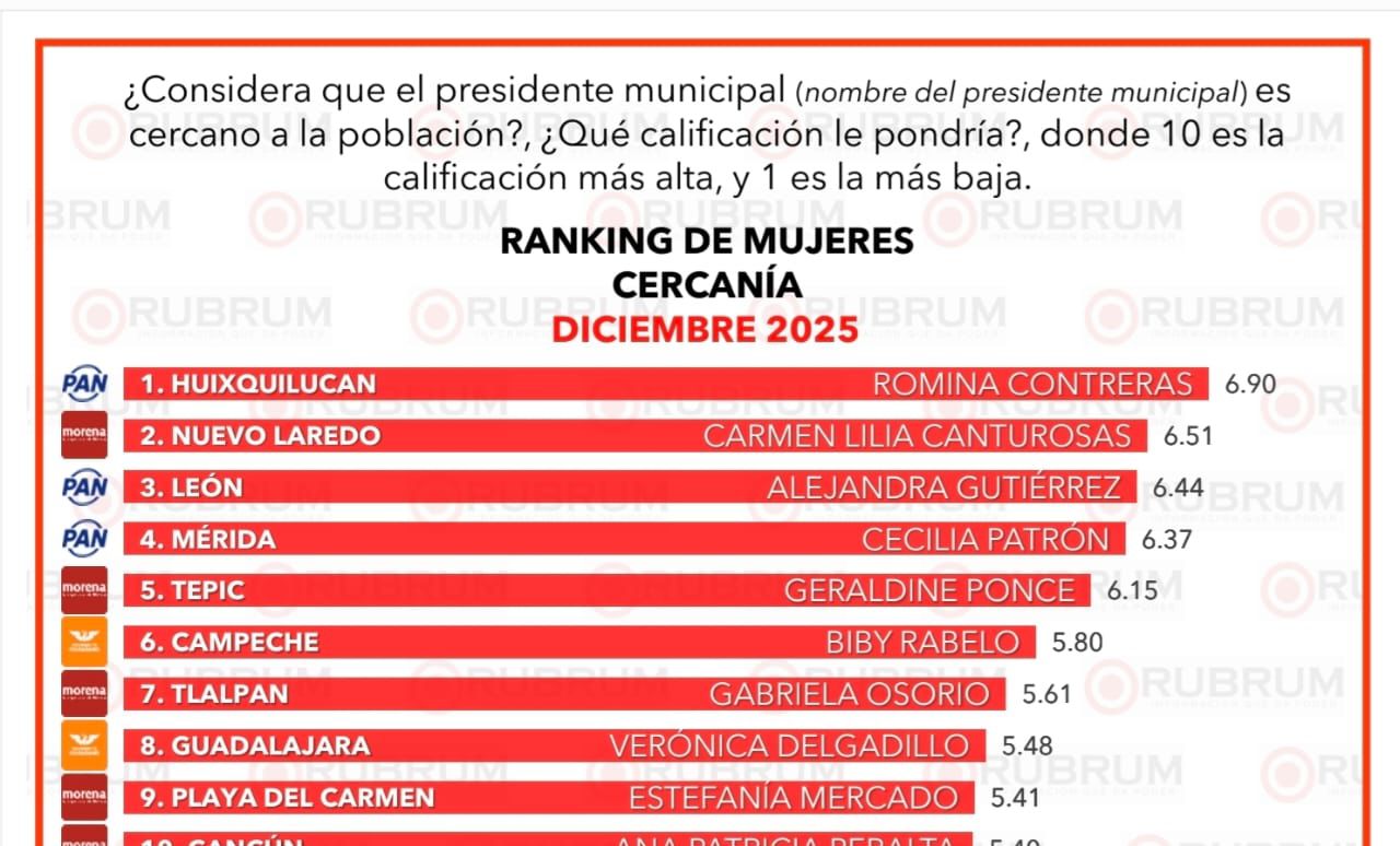 12 de Diciembre del 2025.- El reciente estudio «Evaluación de Alcaldesas – Rubrum» correspondiente al mes de diciembre de 2025 ha traído excelentes noticias para la administración pública de Solidaridad, al confirmar de manera contundente que Estefanía Mercado es la presidenta municipal mejor evaluada de todo el estado de Quintana Roo. Este reconocimiento no es producto de la casualidad, sino el resultado de un trabajo constante que ha logrado mejorar significativamente la percepción que tienen los ciudadanos sobre su calidad de vida, destacando muy por encima de otros líderes municipales de la región que no lograron alcanzar puntuaciones tan altas en este cierre de año.
