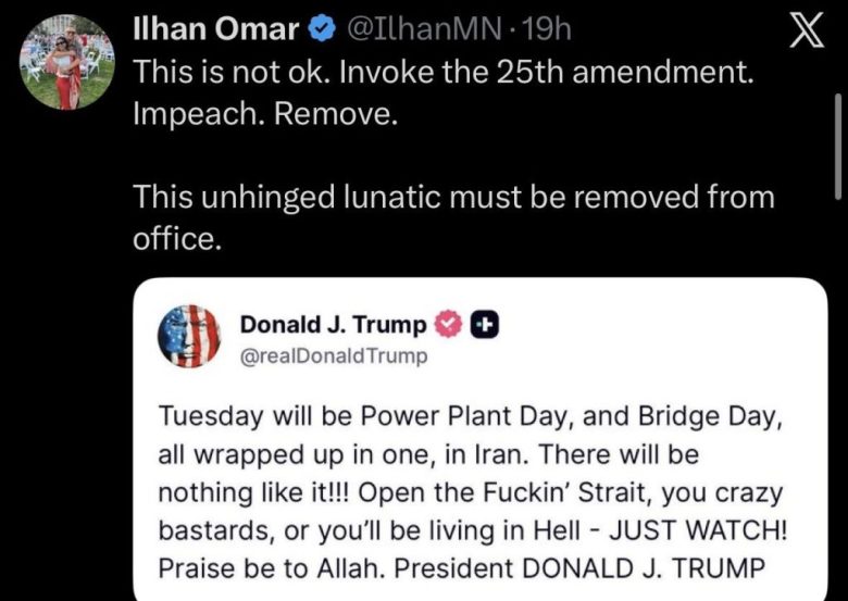 La representante demócrata por Minnesota, Ilham Omar, conocida detractora de Trump, reaccionó diciendo que “esto es inaceptable” y pidió: “Invoquen la 25 Enmienda. Juicio político. Destitución. Este lunático desquiciado debe ser destituido de su cargo”.
