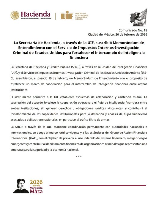 La Secretaría de Hacienda y Crédito Público, mediante la Unidad de Inteligencia Financiera (UIF), ha dado un paso decisivo en la lucha contra los delitos económicos internacionales. El pasado 19 de febrero de 2026, las autoridades mexicanas formalizaron un compromiso estratégico con el Servicio de Impuestos Internos–Investigación Criminal (IRS-CI) de los Estados Unidos. Este encuentro marca una nueva etapa en la vigilancia de los recursos de procedencia ilícita, asegurando que los sistemas de la inteligencia financiera binacional operen con mayor rapidez y precisión en beneficio de ambos países.