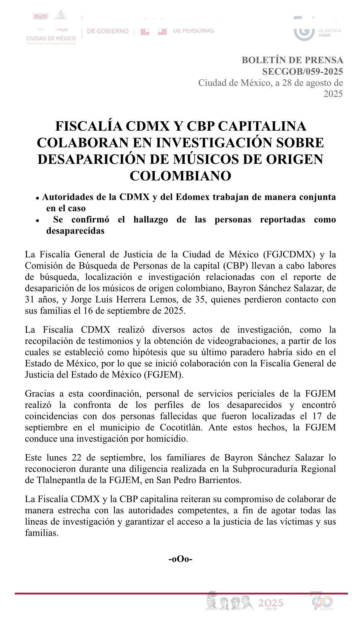 Los perfiles de los músicos coincidieron con los de dos cuerpos encontrados el 17 de septiembre en Cocotitlán, Estado de México. La FGJ-Cdmx inició la investigación tras la desaparición, recopilando testimonios y revisando grabaciones para establecer la última ubicación de los artistas. Esta labor llevó a una colaboración crucial con la Fiscalía General de Justicia del Estado de México (Fgjem), que asumió un papel central en el caso. Esta confirmación del hallazgo ha generado una profunda consternación entre sus seguidores y la comunidad artística, mientras las autoridades se apresuran a esclarecer los detalles de este doble homicidio.