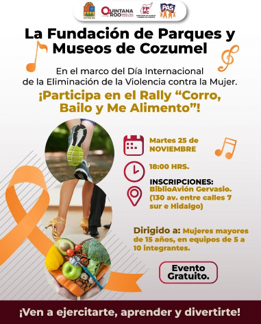 19 DE NOVIEMBRE DEL 2025 – LOCAL. La Fundación de Parques y Museos de Cozumel (FPMC) ha lanzado una invitación abierta a todas las mujeres mayores de 15 años para participar en el rally denominado «Corro, Bailo y Me Alimento«. Esta actividad lúdica y educativa se llevará a cabo el próximo martes 25 de noviembre a las 18:00 horas en el BiblioAvión Gervasio. La iniciativa es completamente gratuita y se realiza en el marco del Día Internacional de la Eliminación de la Violencia contra la Mujer. Su objetivo principal es triple: impulsar la activación física, promover estilos de vida saludables y generar una reflexión comunitaria.