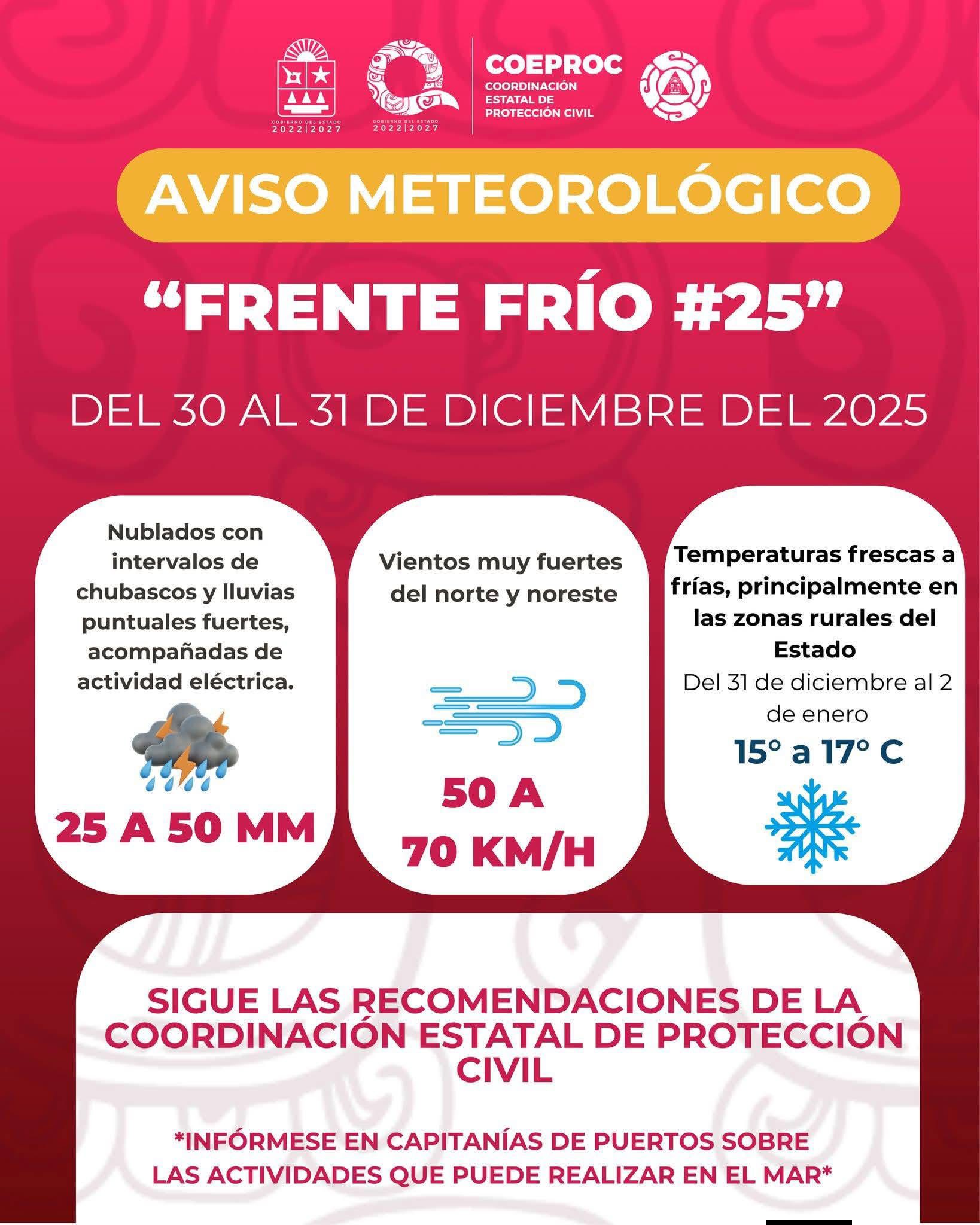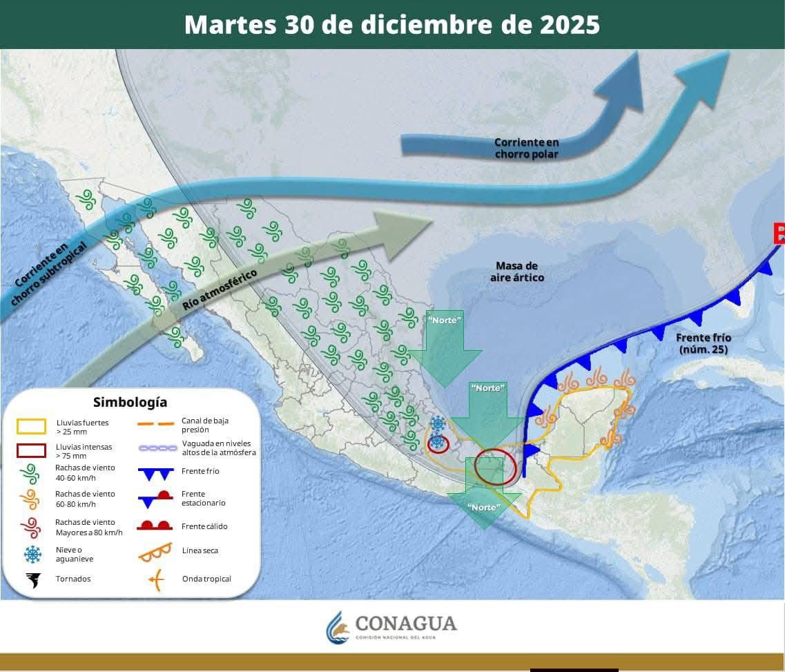 29 DE DICIEMBRE DE 2025. Debido al acercamiento y desplazamiento del Frente Frío 25, así como de la vaguada prefrontal que lo acompaña, autoridades meteorológicas informaron que se esperan condiciones climáticas adversas en la porción norte de la Península de Yucatán y en el estado de Quintana Roo a partir del martes 30 y miércoles 31 de diciembre.