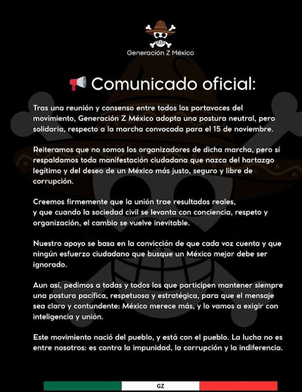 Aunque el nombre “Generación Z México” aparece vinculado a la convocatoria, el colectivo aclaró que no organiza la marcha, aunque respalda cualquier manifestación ciudadana derivada del hartazgo social. “Nuestra lucha no es contra otros; es contra la impunidad, la corrupción y la indiferencia”, señalaron en un comunicado oficial.