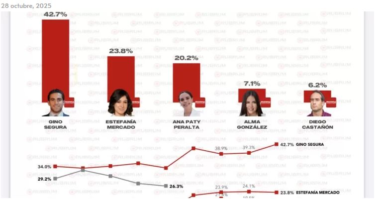 El estudio, realizado el 27 de octubre de 2025 mediante 800 entrevistas telefónicas automatizadas en todo el estado, muestra que Gino Segura encabeza con 42.7 % de apoyo, seguido por Estefanía Mercado con 23.8 %. En tercer lugar aparece la presidenta municipal de Cancún, Ana Paty Peralta, con 20.2 %, mientras que Alma González y Diego Castañón obtienen 7.1 % y 6.2 %, respectivamente.