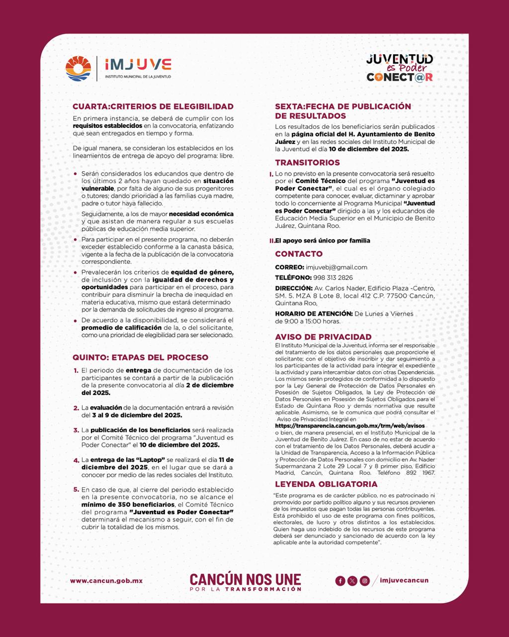 26 NOVIEMBRE 2025-CANCUN, BENITO JUAREZ- El Gobierno de Benito Juárez presentó el programa Juventud es Poder, una iniciativa que busca reducir la brecha digital entre los jóvenes cancunenses y fortalecer su desempeño escolar mediante la entrega de 350 laptops a estudiantes de nivel medio superior. De acuerdo con el Instituto Municipal de la Juventud (IMJUVE), este apoyo está dirigido a jóvenes de entre 15 y 20 años que estudian en instituciones públicas y cuyas condiciones socioeconómicas dificultan su acceso a herramientas tecnológicas. La convocatoria tiene como propósito que el beneficio llegue realmente a quienes más lo requieren, promoviendo así un desarrollo académico equitativo.