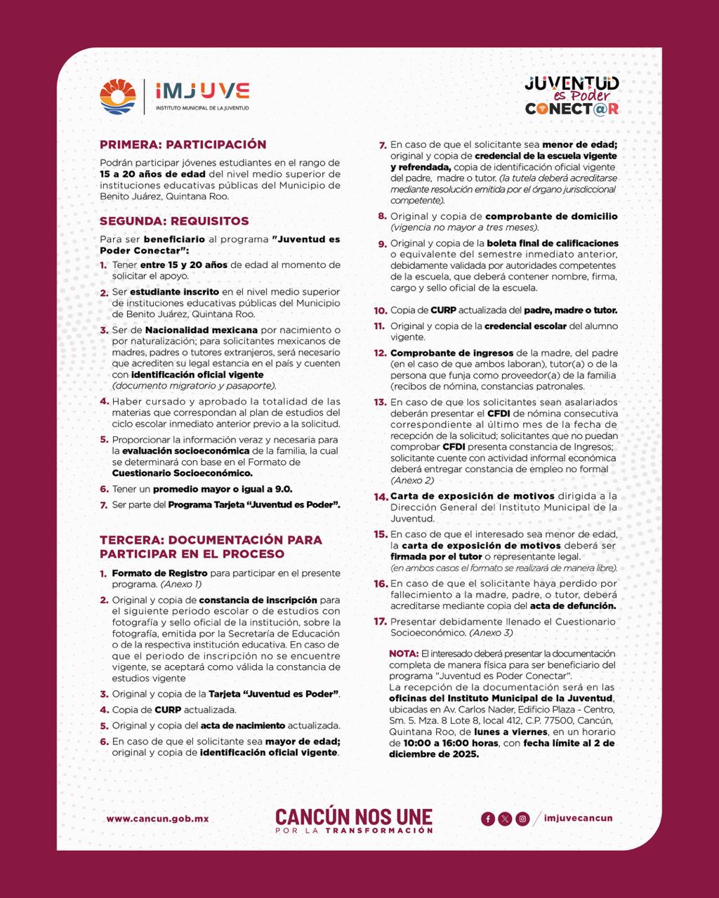 Por último, el Ayuntamiento recordó que las personas interesadas pueden consultar más detalles en el portal oficial de convocatorias de Cancún, así como comunicarse al número 998 313 2826 o contactar vía redes sociales al Instituto Municipal de la Juventud.
