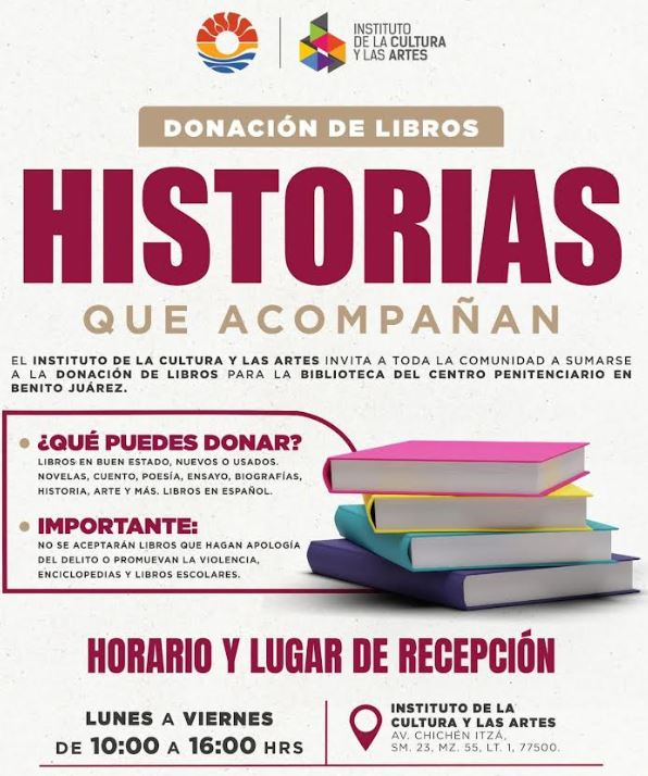 20.-.Octubre.-.2025.-.Con el propósito de promover la lectura, el desarrollo personal y la transformación social, el Ayuntamiento de Benito Juárez, a través del Instituto de la Cultura y las Artes, lanzó la iniciativa “Historias que acompañan”, una campaña de donación de libros dirigida a fortalecer la biblioteca del Centro de Reinserción Social (Cereso) de Cancún.