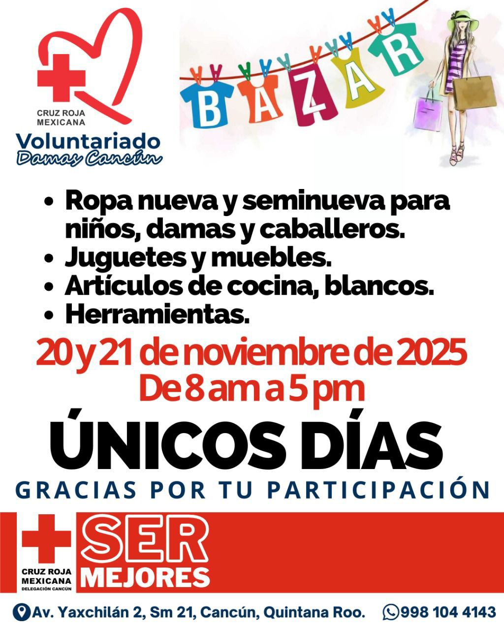 La continuidad de este bazar por más de dos décadas es un reflejo de la gran generosidad de la comunidad de Cancún. La Delegación agradece profundamente a todos los que hacen posible esta actividad: desde los donantes que entregan artículos en buen estado, hasta los compradores que acuden a la sede y, por supuesto, a los voluntarios que dedican su tiempo. La consigna es clara: apoyar con la visita es apoyar la causa de la Cruz Roja.