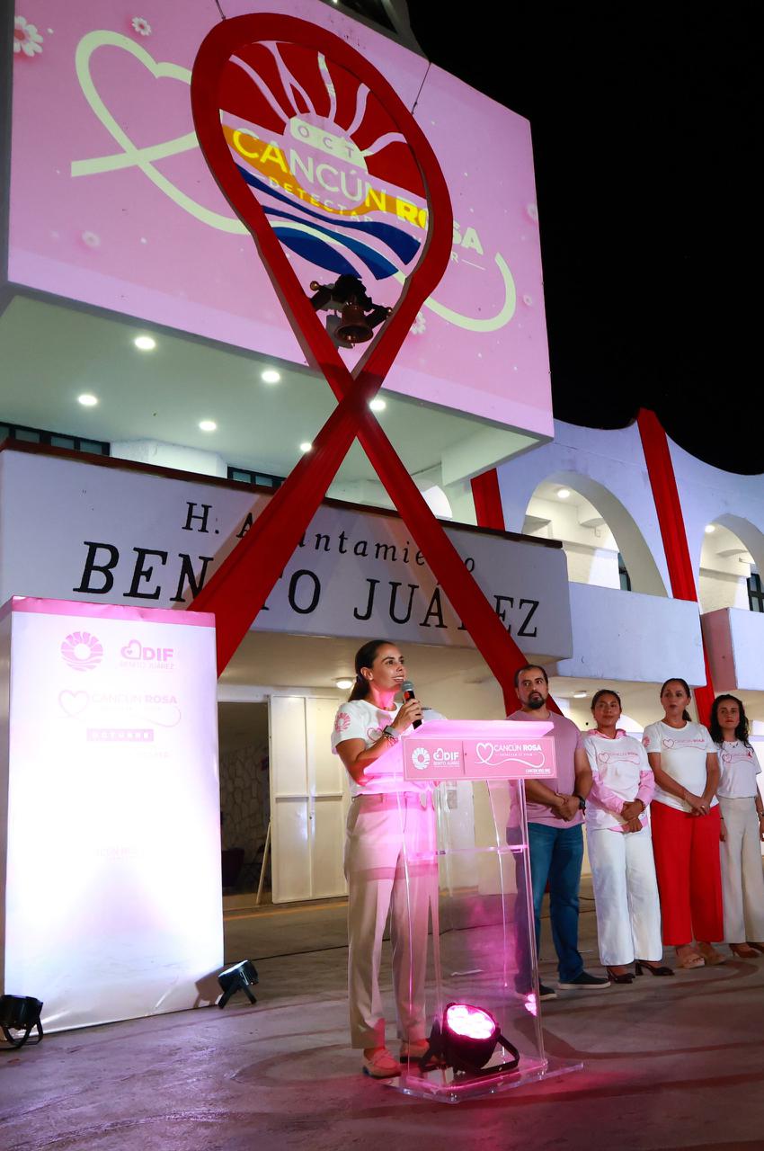 Cancún, Q. Roo, a 07 de octubre de 2025.- En el marco de la campaña Cancún Rosa, impulsada por el DIF Benito Juárez, la presidenta municipal Ana Paty Peralta encabezó la ceremonia de encendido de la fachada del Palacio Municipal, que se tiñó de rosa como símbolo de esperanza, unión y conciencia en la lucha contra el cáncer de mama. El evento, titulado Cancún se Pinta de Rosa por las Mujeres, reunió a instituciones públicas, organizaciones civiles, empresas y ciudadanía comprometida con la prevención y detección temprana de esta enfermedad.