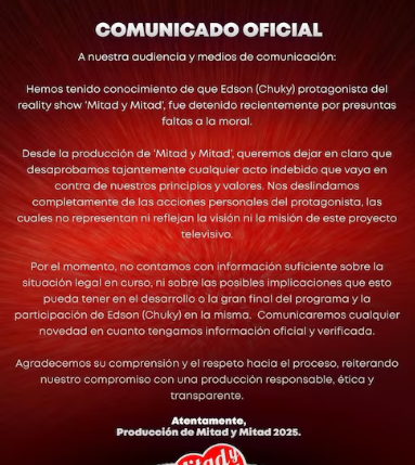 Ante la detención de uno de sus finalistas, el equipo de Mitad y Mitad se apresuró a deslindarse de las acciones personales del concursante. En el mensaje compartido en redes sociales, la producción fue clara al expresar que “desaprueban cualquier falta a la moral” y reiteraron que no tienen responsabilidad alguna sobre el comportamiento privado de quienes participan en la competencia. Esta postura busca proteger la imagen del programa ante las serias acusaciones que pesan sobre «El Chucky» en Nuevo León.