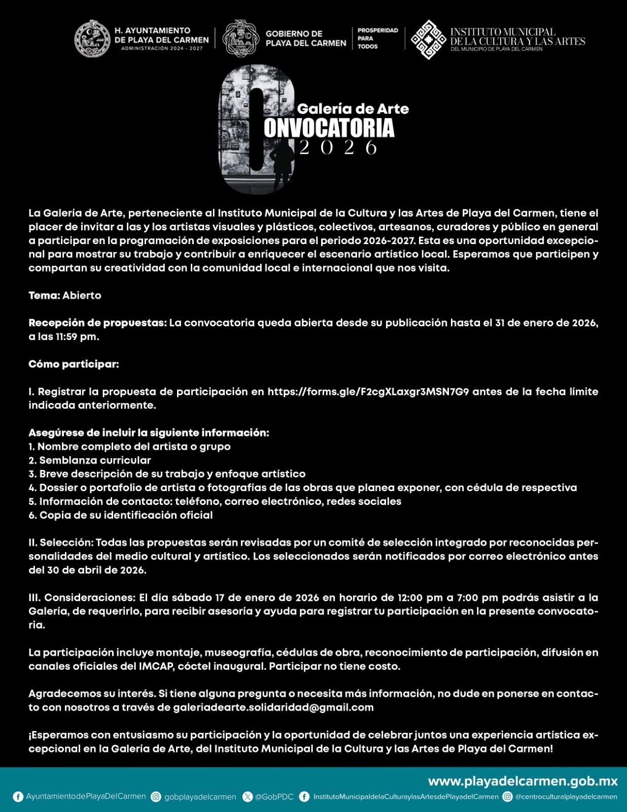 La Alcaldesa ha mantenido un contacto muy cercano con los artistas playenses, asegurando que las puertas del Palacio Municipal siempre estén abiertas para sus propuestas. Ernesto Santiago Martínez Cuéllar, director del IMCAP, señaló que el objetivo es que el talento local se difunda mediante eventos organizados por el instituto. Esta invitación cultural está dirigida a pintores, escultores, colectivos, artesanos y al público en general que desee enriquecer el escenario artístico de nuestra ciudad con sus obras originales.