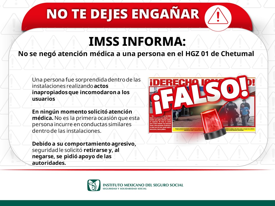 CHETUMAL, QUINTANA ROO 22 de septiembre de 2025 – En respuesta a las recientes publicaciones virales en redes sociales que acusan al Hospital General de Zona con Medicina Familiar (HGZ/MF) No. 1 de negar atención a un individuo, la representación del IMSS en Quintana Roo ha emitido un comunicado oficial. El objetivo de la declaración es desmentir la versión que circula y aclarar los hechos que llevaron a la intervención de las autoridades en las instalaciones hospitalarias. El comunicado del Instituto Mexicano del Seguro Social busca ofrecer una perspectiva clara y detallada para sus usuarios, desmintiendo la noticia falsa sobre la atención negada.