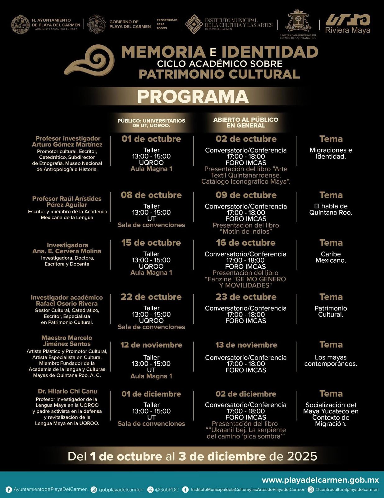 El ciclo continuará este jueves a las 17:00 horas, con la presentación de la novela “El motín de los indios”, del propio Doctor Raúl Arístides Pérez Aguilar. La actividad se realizará en el Foro Cultural del Instituto Municipal de la Cultura y las Artes de Playa del Carmen y estará abierta al público de forma gratuita, reafirmando el compromiso de la administración municipal con la difusión del conocimiento y la participación comunitaria.