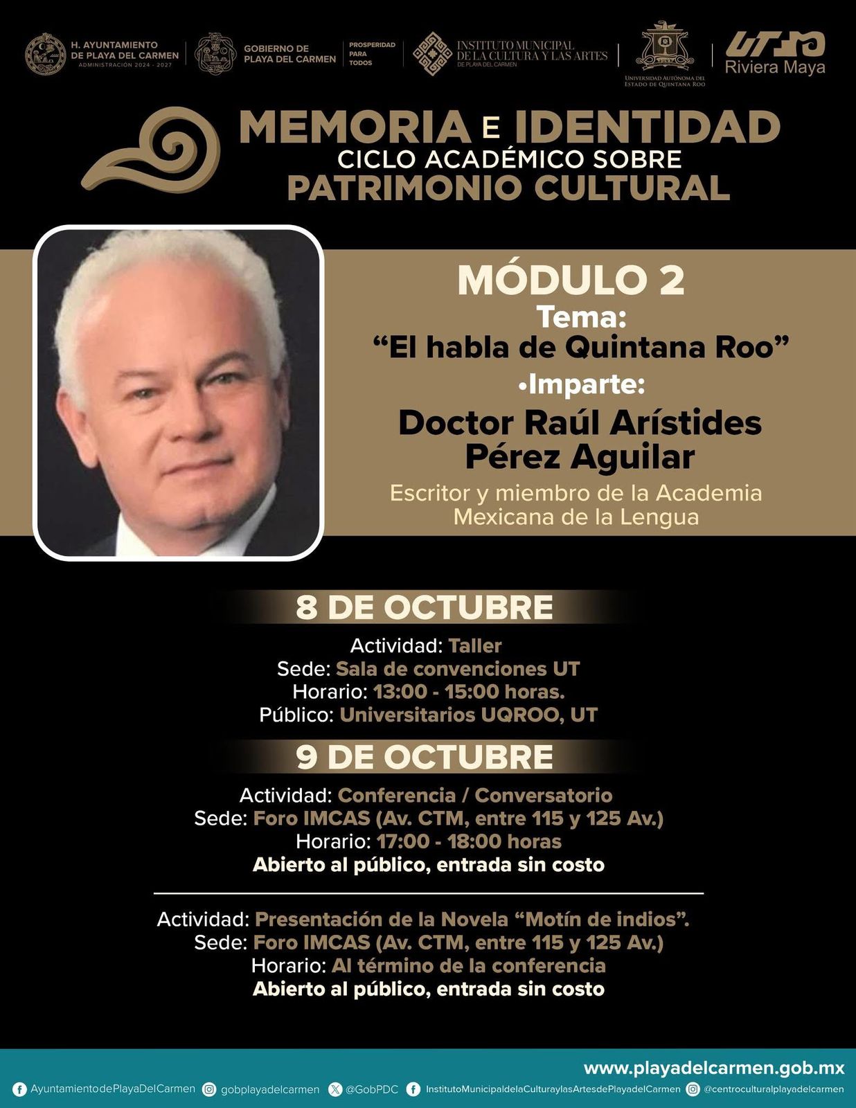 Playa del Carmen, Quintana Roo, 10 de octubre de 2025. — En un esfuerzo por rescatar y valorar la identidad lingüística quintanarroense, el Instituto Municipal de la Cultura y las Artes llevó a cabo el taller “Así hablamos en Quintana Roo”, impartido por el Doctor Raúl Arístides Pérez Aguilar, reconocido escritor y miembro de la Academia Mexicana de la Lengua. Esta actividad formó parte del ciclo académico “Memoria e Identidad: Patrimonio Cultural”, una iniciativa que busca promover la reflexión sobre las raíces culturales y lingüísticas del estado.