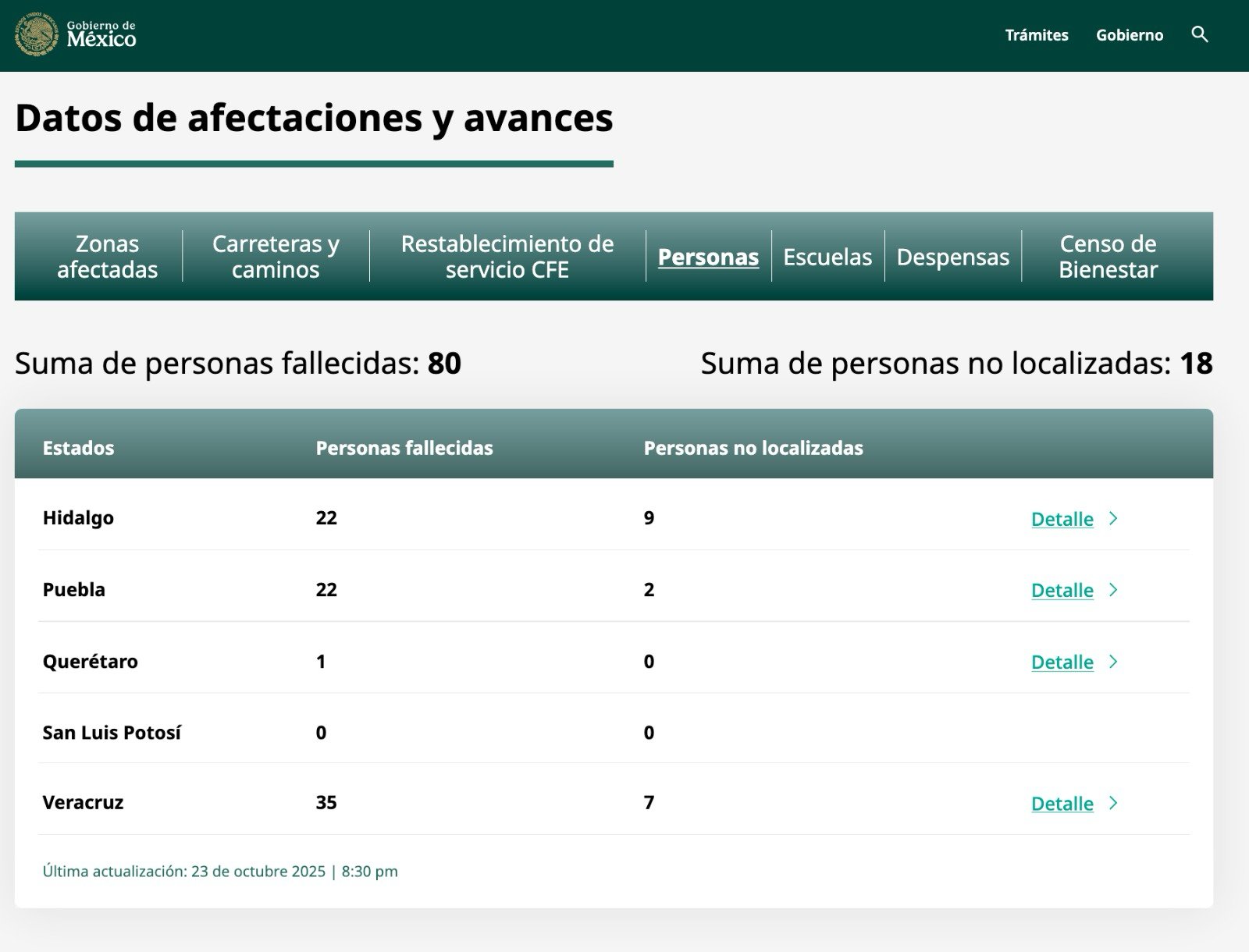 Las intensas lluvias y las consecuentes inundaciones que han afectado a diversas regiones del país han dejado una dolorosa huella de destrucción y pérdida. El gobierno federal confirmó un saldo trágico: 80 personas han perdido la vida y 18 más se encuentran en calidad de desaparecidas. Estos números reflejan la magnitud de la emergencia que se vive en, al menos, cinco estados de la República, donde los equipos de rescate y auxilio se mantienen activos.