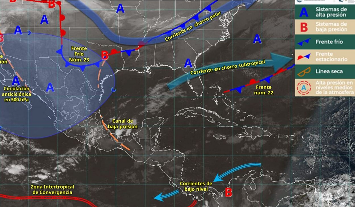 Por otra parte, el nuevo frente frío número 23 ingresará por el norte de Coahuila, generando rachas de viento y un descenso en las temperaturas durante la tarde en esa región. Este sistema, en combinación con la entrada de aire húmedo del Golfo de México, provocará lluvias fuertes en Tamaulipas, especialmente en la zona de Mante y el sur del estado.