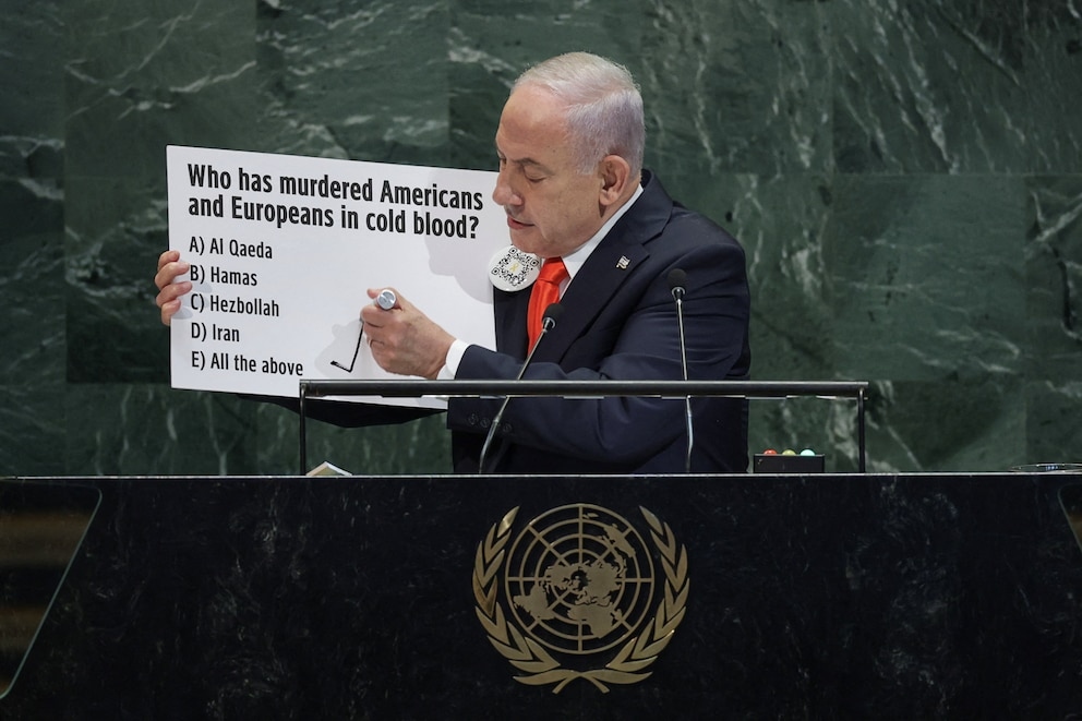 Continuando con su particular estilo, Netanyahu convirtió parte de su discurso en un «concurso de preguntas». Mostrando un cartel con opciones, preguntó a la asamblea: «¿Quién grita ‘muerte a América’?». Tras listar a Irán, Hamas, Hezbollah y los hutíes, él mismo respondió que la opción correcta era «todos». Repitió la dinámica con otra pregunta: «¿Quién ha asesinado a americanos y a europeos a sangre fría?», incluyendo a Al Qaeda entre las opciones, para concluir nuevamente que «todas las respuestas son correctas», buscando así trazar una línea directa entre diversas organizaciones y el terrorismo global.