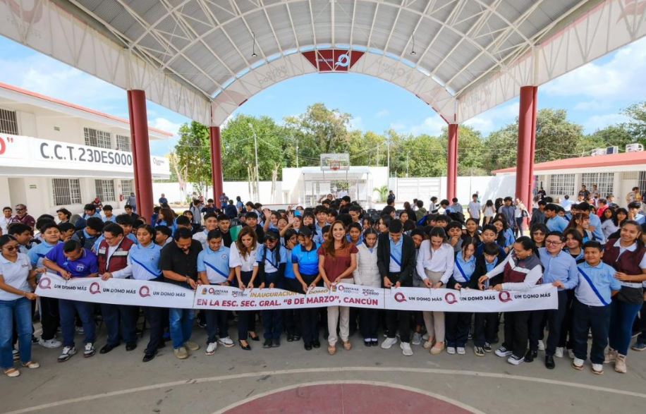 24 DE FEBRERO DEL 2026 – LOCAL. La gobernadora Mara Lezama Espinosa cumplió con un compromiso previo al entregar formalmente un nuevo domo deportivo y cultural en la Secundaria General “8 de Marzo” en Cancún. Esta obra representa un avance significativo para la comunidad escolar, permitiendo que más de mil 200 jóvenes realicen sus actividades diarias protegidos del sol y la lluvia. Con esta entrega, el gobierno estatal reafirma su intención de mejorar la calidad en espacios escolares mediante inversiones que lleguen de manera directa a quienes más lo necesitan.