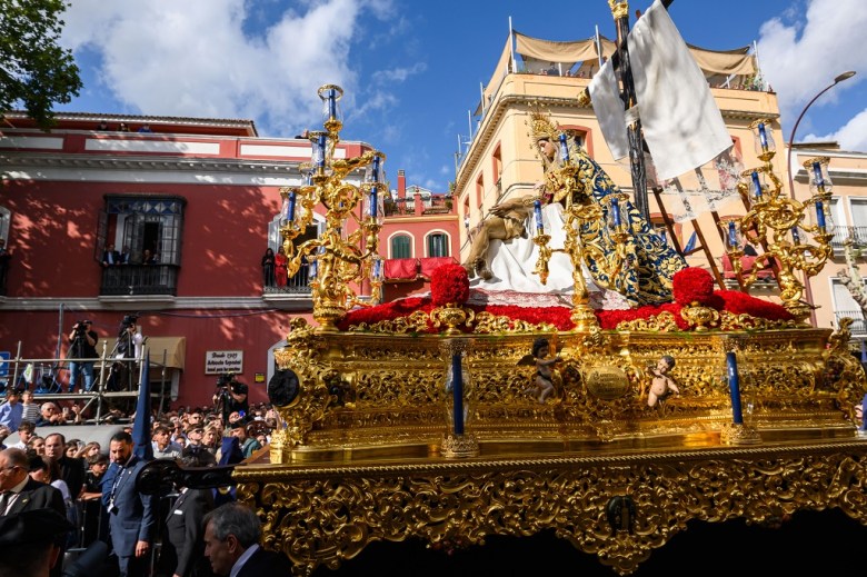 SEVILLA.- El Santísimo Cristo de la Misericordia y Nuestra Señora de la Piedad de la Hermandad de El Baratillo a su salida, este Miércoles Santo en Sevilla. EFE/ Raúl Caro.