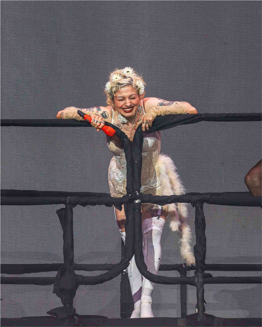 Ahora con una estética de cabaret, la cantante trajo de gira su ‘Autopoiética’ (2023) al Vive, y es impresionante cómo nos puso a cantar iniciando la noche del domingo, con bolero, pop, rock and roll y hasta ska. Mon domina varios géneros y su banda de apoyo exhibe una ejecución impecable.