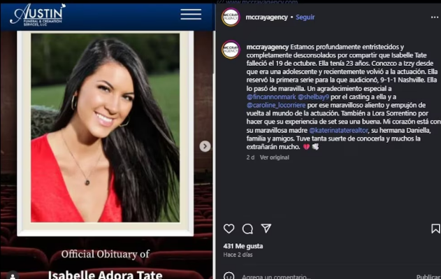 La noticia fue confirmada por su agencia de representación McCray, con sede en Nashville, a través de un comunicado en redes sociales. “Estamos profundamente tristes y con el corazón roto al compartir que Isabelle Tate falleció el 19 de octubre”, publicaron en Instagram. El mensaje añadió que Isabelle, a quien conocían desde su adolescencia, había retomado recientemente su carrera y logró conseguir el papel en la primera serie para la que audicionó.