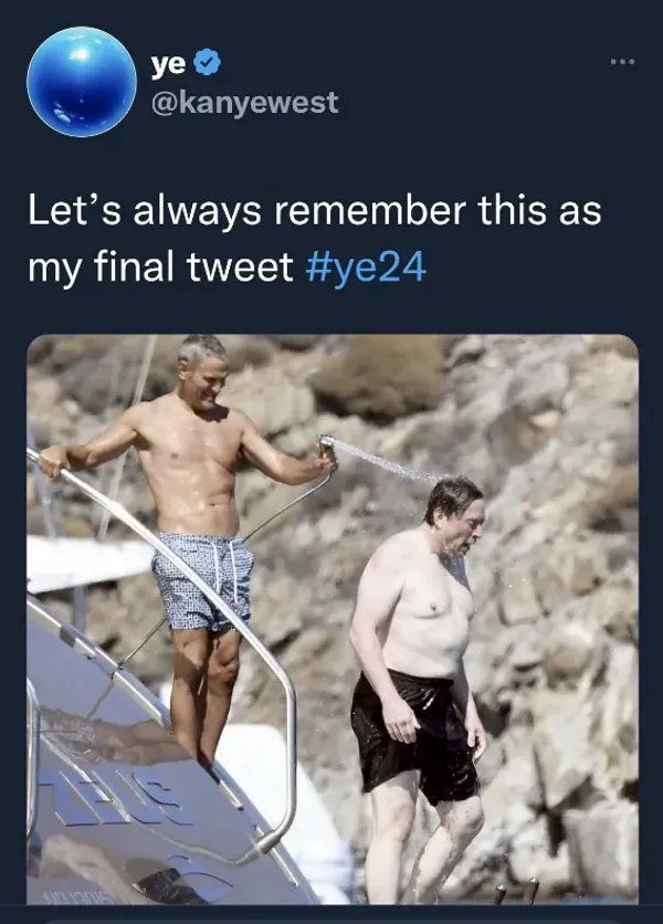 Las referencias hacia Elon Musk no son sorpresivas, pues recordemos que en diciembre de 2022 Ye terminó con la cuenta de X bloqueada después de publicar una foto donde Elon Musk era mojado con una mangera por Ari Emanuel, CEO de William Morris Endeavor.