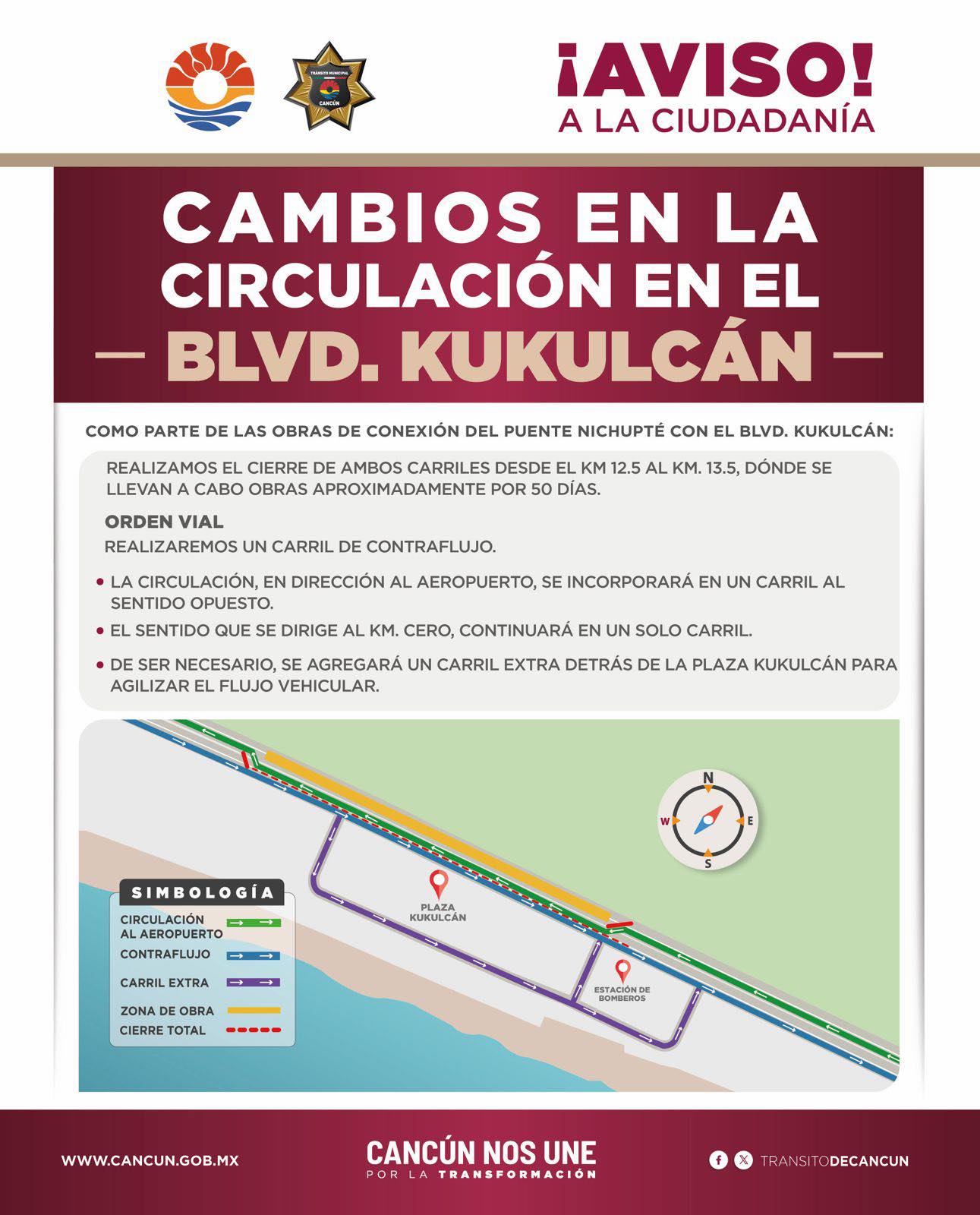 Cancún, Q. R. – Se informa a todos los cancunenses y visitantes sobre importantes modificaciones en la circulación vial de la Zona Hotelera, las cuales son necesarias para avanzar en la conexión del Puente Nichupté con el Boulevard Kukulcán. Las obras, parte de un proyecto de infraestructura mayor, se concentrarán en el tramo que abarca desde el kilómetro 12.5 hasta el kilómetro 13.5 de la vía. Las autoridades han solicitado a los automovilistas tomar todas las precauciones necesarias y planificar sus recorridos con antelación para evitar retrasos y contratiempos durante este periodo de trabajos.