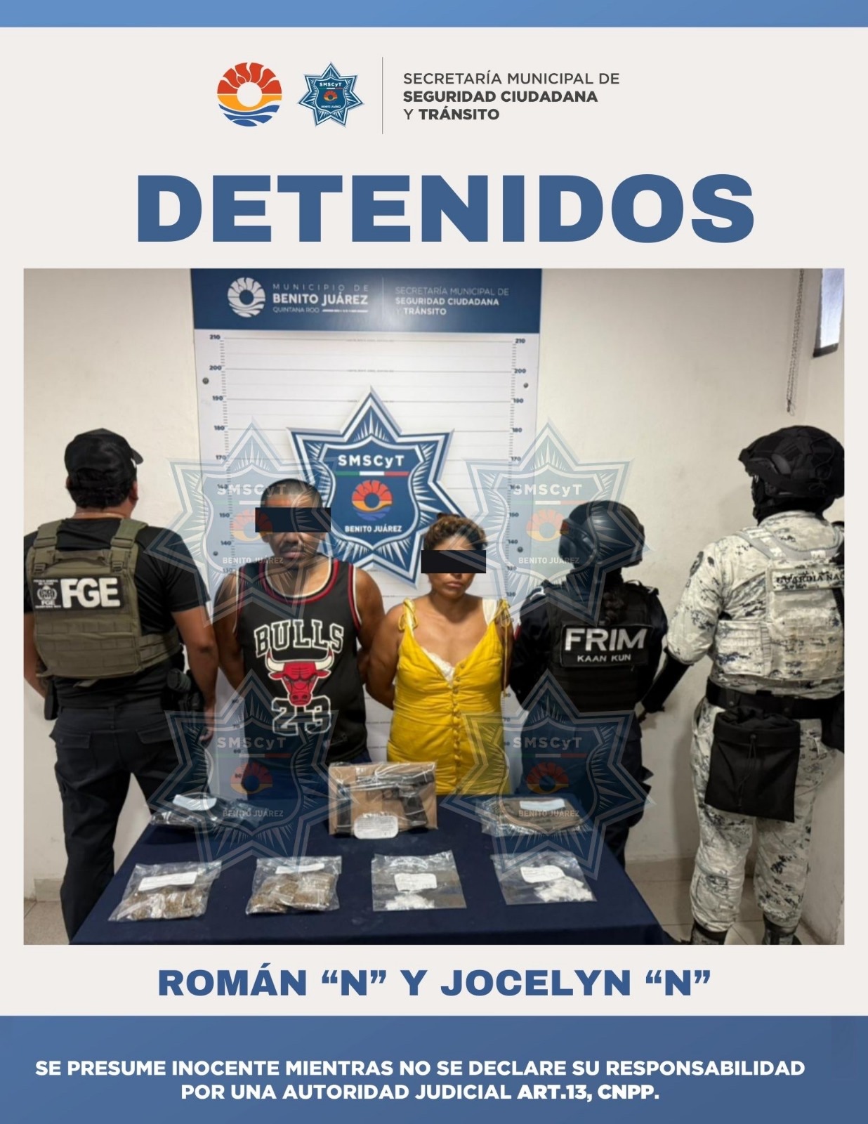 Cancún, Q. Roo., a 29 de septiembre de 2025.- En un claro ejemplo de colaboración interinstitucional, se llevó a cabo una acción coordinada que culminó en la detención de dos personas por presuntos delitos graves. La operación involucró a la Guardia Nacional, la Fiscalía General del Estado (FGE) y la Secretaría Municipal de Seguridad Ciudadana y Tránsito (SMSCyT) de Benito Juárez. Un hombre y una mujer fueron puestos bajo custodia como presuntos implicados en delitos contra la salud, además de violar la ley federal de armas de fuego y explosivos, reafirmando el compromiso con la seguridad en el municipio.