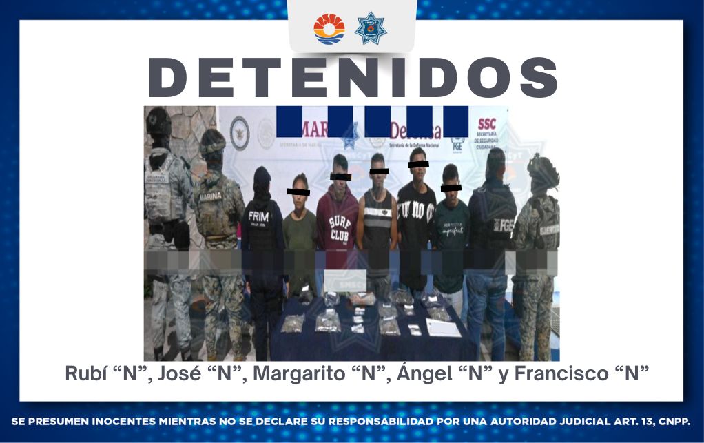 6 DE ABRIL DEL 2026 – LOCAL. En una acción contundente para reforzar la seguridad en Cancún, diversas corporaciones de seguridad lograron la detención de cinco personas en la Supermanzana 92. Este resultado fue posible gracias al trabajo conjunto entre la Policía de Cancún, la Fiscalía General del Estado, la Guardia Nacional, el Ejército Mexicano y la Secretaría de Marina. Durante el operativo, los agentes detectaron a los sospechosos en posesión de una gran cantidad de sustancias ilícitas, lo que derivó en su arresto inmediato por delitos relacionados con narcóticos.