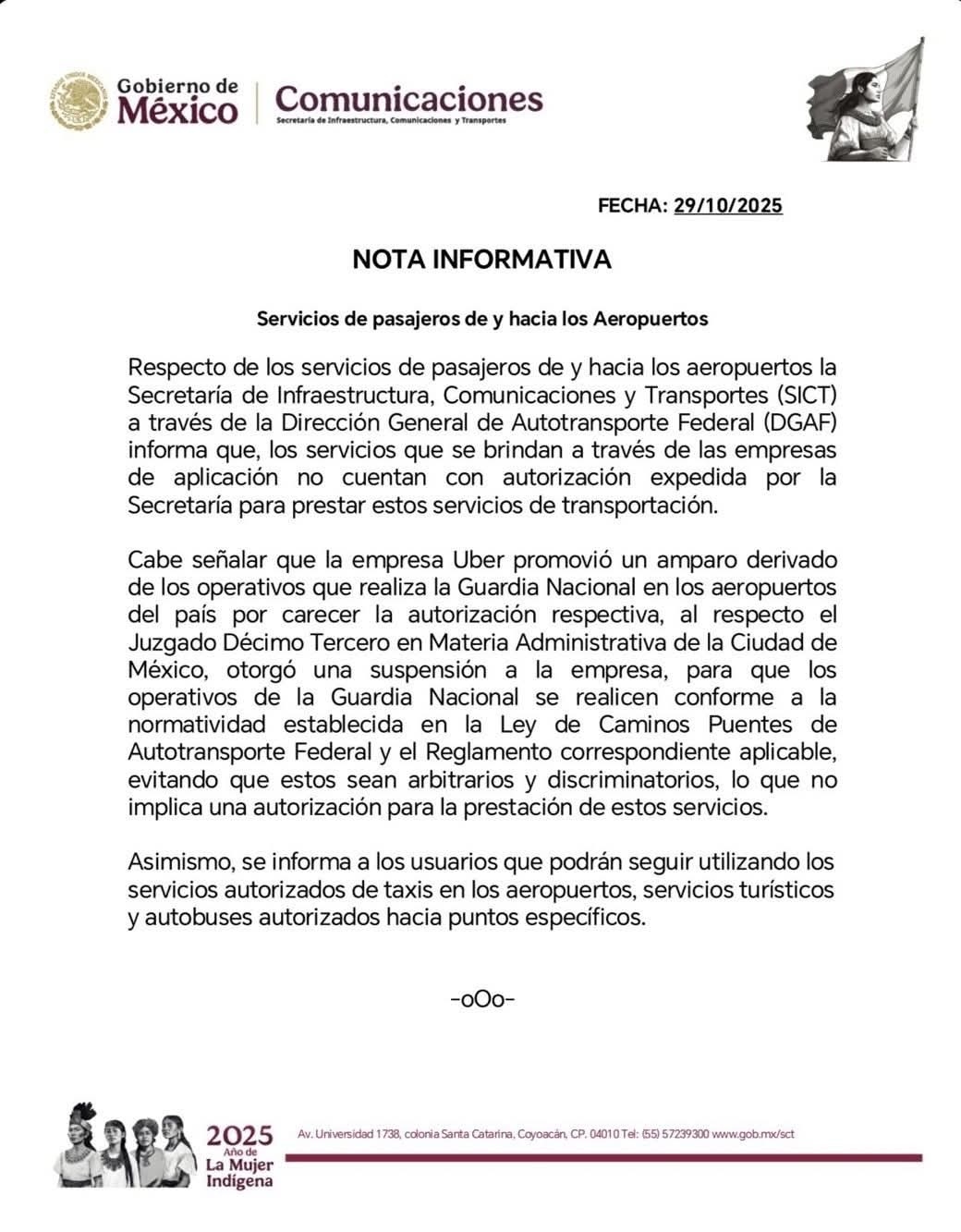 30 de Octubre del 2025.- La situación de Uber en el Aeropuerto de Cancún enfrenta un nuevo obstáculo, a pesar de los recientes fallos judiciales. La Secretaría de Infraestructura, Comunicaciones y Transportes (SICT) informó anoche que los servicios de esta plataforma digital no tienen permiso para operar en la terminal aérea. Esta aclaración se produce aunque Uber obtuvo una suspensión definitiva por parte de un juzgado federal, la cual buscaba permitir su operación en dicho aeropuerto.