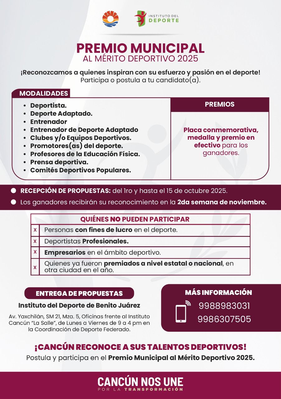 Cancún, Q. Roo, 3 de octubre de 2025.– El Ayuntamiento de Benito Juárez anunció la apertura de la convocatoria para el Premio Municipal al Mérito Deportivo 2025, una distinción que busca reconocer la entrega, pasión y constancia de atletas, entrenadores, promotores y maestros que han dejado huella en el ámbito deportivo local. Con este anuncio se pretende motivar a quienes hacen del deporte un ejemplo de disciplina y superación.