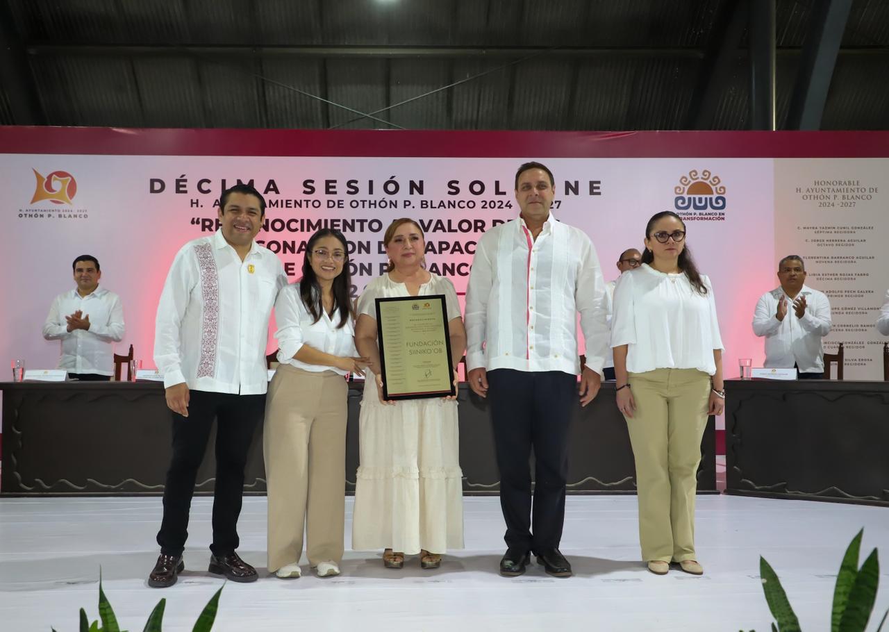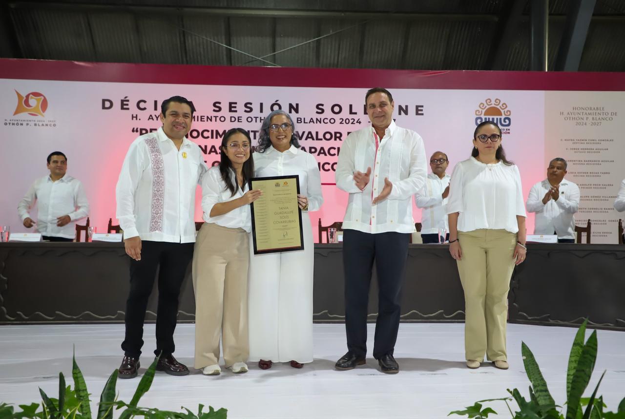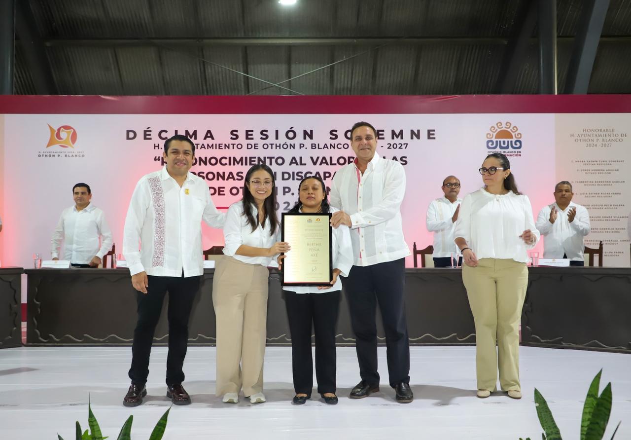 En un evento lleno de emoción y respeto, el Ayuntamiento de Othón P. Blanco celebró su Décima Sesión Solemne para honrar a ciudadanos ejemplares de la capital. La presidenta municipal, Yensunni Martínez Hernández, encabezó la entrega del galardón que destaca el Valor de las Personas con Discapacidad, otorgado este año a Bertha Peña Ake, Tania Guadalupe Solís Covarrubias y a la Fundación Siiniko’ob. Este reconocimiento busca visibilizar el esfuerzo diario y los grandes logros de quienes, a pesar de las barreras físicas o sociales, trabajan incansablemente por mejorar su comunidad.