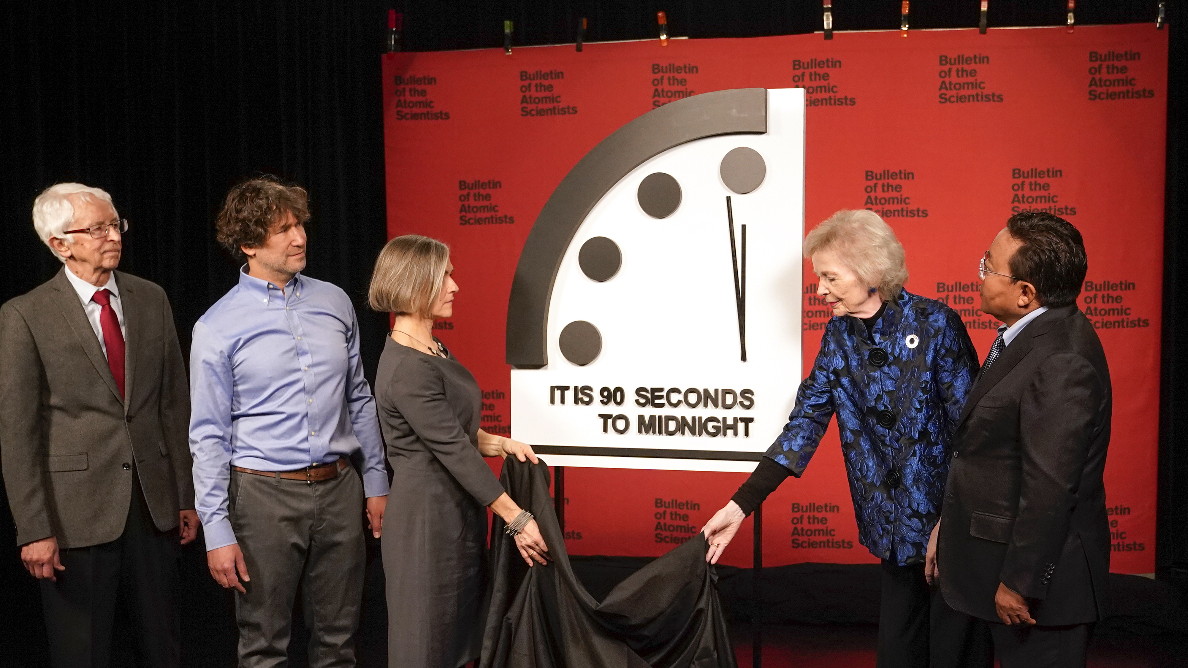 El año pasado, en 2023, el reloj se situó a 90 segundos de la medianoche. Esto debido, entre otras cosas, a la invasión rusa en Ucrania, la amenaza nuclear, la salida temporal de Rusia en el último tratado de armas nucleares, Corea del Norte y la escalada de amenaza nuclear, crisis climáticas, avance de tecnologías, amenazas biológicas como la del COVID-19, etc.