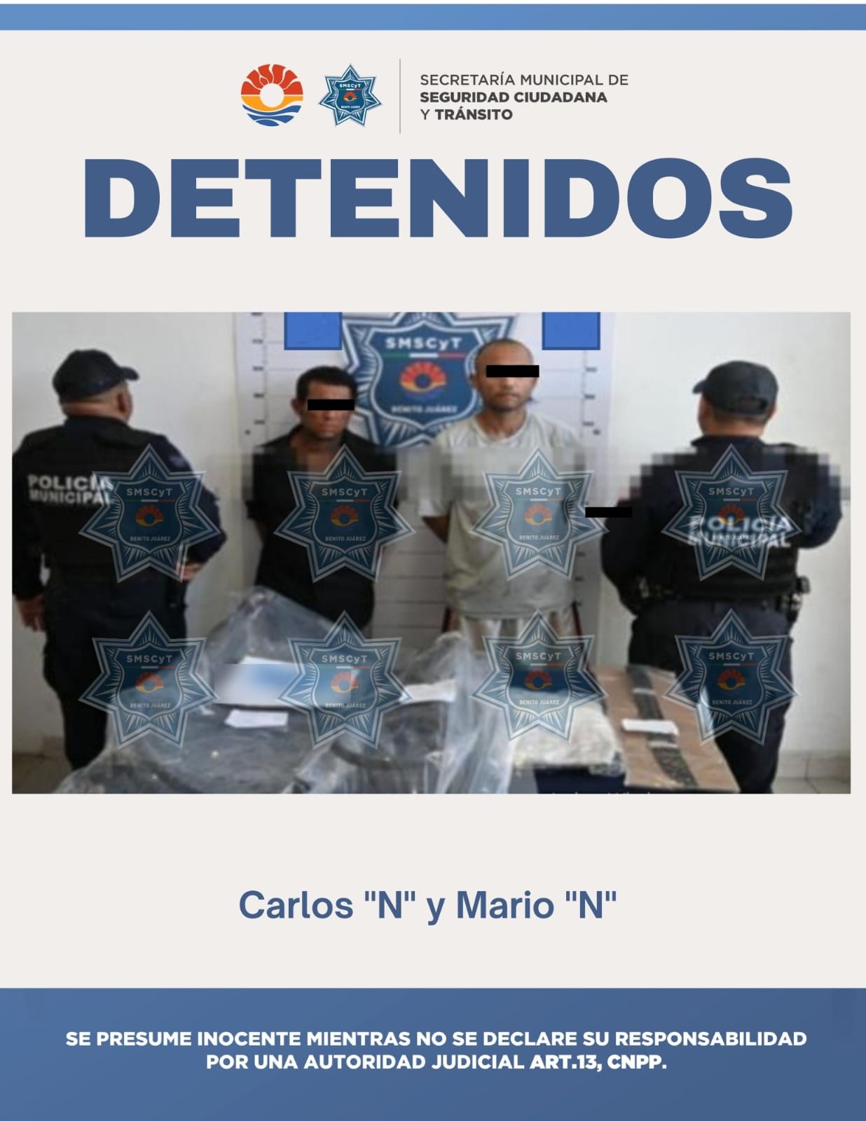 Derivado de estos hechos, Carlos “N”, de 34 años de edad, originario del estado de Tabasco, y Mario “N”, de 33 años, originario de Veracruz, fueron detenidos por su probable participación en el robo de cables en Cancún. Ambos fueron trasladados y puestos a disposición de la autoridad correspondiente para el inicio de las diligencias legales.