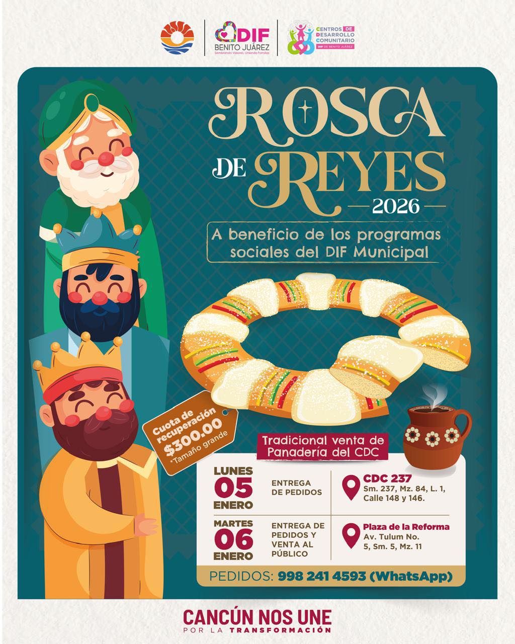 La Rosca de Reyes DIF Benito Juárez tiene una cuota de recuperación de 300 pesos y puede solicitarse de manera sencilla a través de WhatsApp al número 998 241 4593. Lo recaudado será destinado a fortalecer acciones sociales, asistenciales y comunitarias que impulsa el DIF en distintas colonias de Cancún.