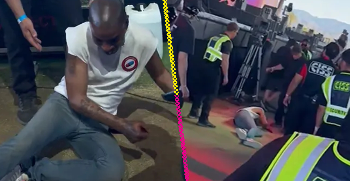 Resulta que al caer, Kid Cudi quedó en el suelo y tuvo que ser auxiliado. Dos guardias de seguridad en Coachella lo ayudaron a levantarse y se lo llevaron cargando entre brazos y con los fans confundidos por lo que había sucedido en esos minutos.