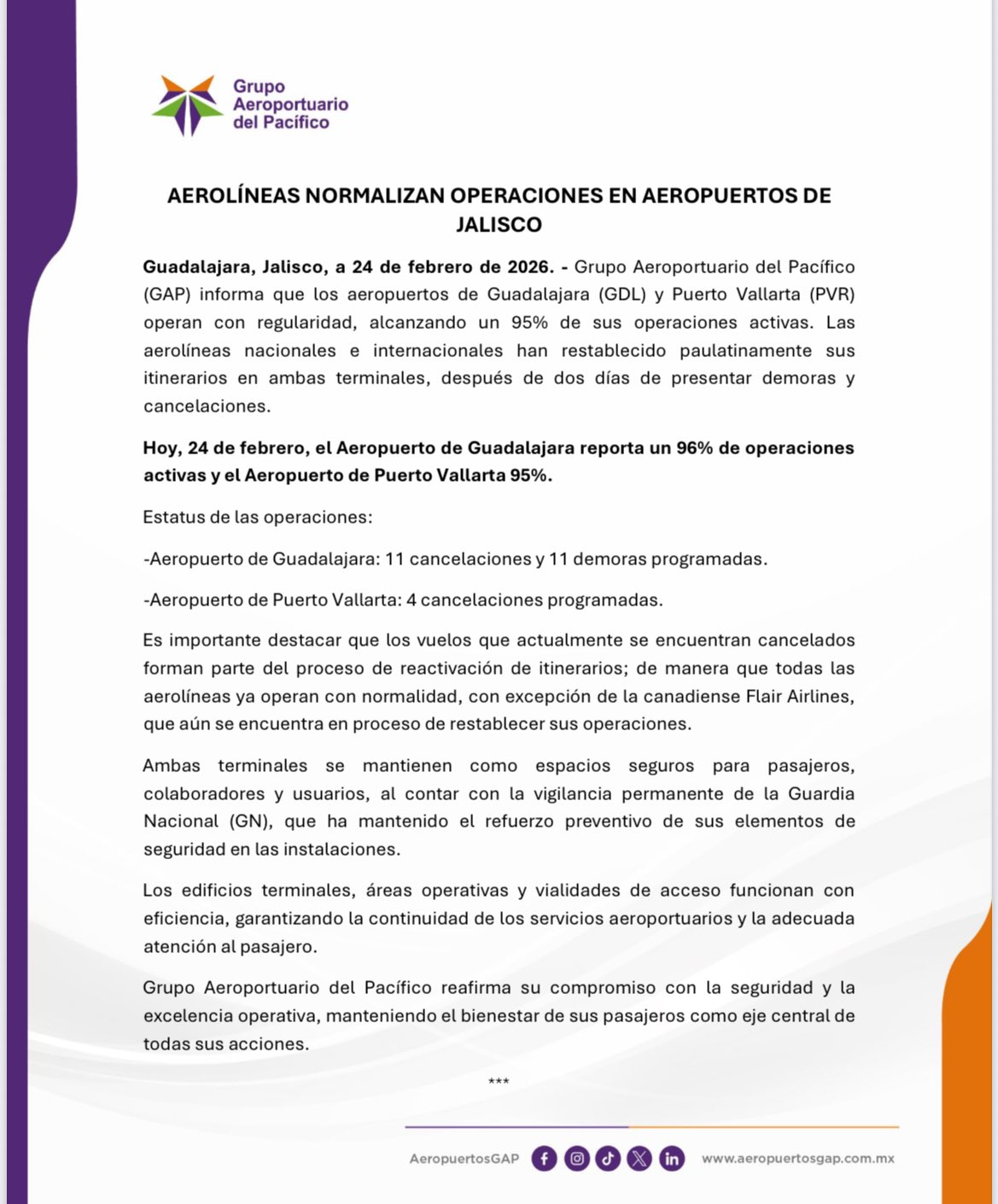 El Grupo Aeroportuario del Pacífico (GAP) ha dado a conocer excelentes noticias para los viajeros, confirmando que las operaciones en los aeropuertos de la entidad se encuentran prácticamente restablecidas. Después de una jornada marcada por diversas interrupciones que afectaron a miles de pasajeros, las terminales aéreas más importantes del estado han logrado recuperar su ritmo habitual. Este avance representa un alivio para el sector turístico y comercial, permitiendo que la conectividad aérea de la región vuelva a la normalidad casi en su totalidad.