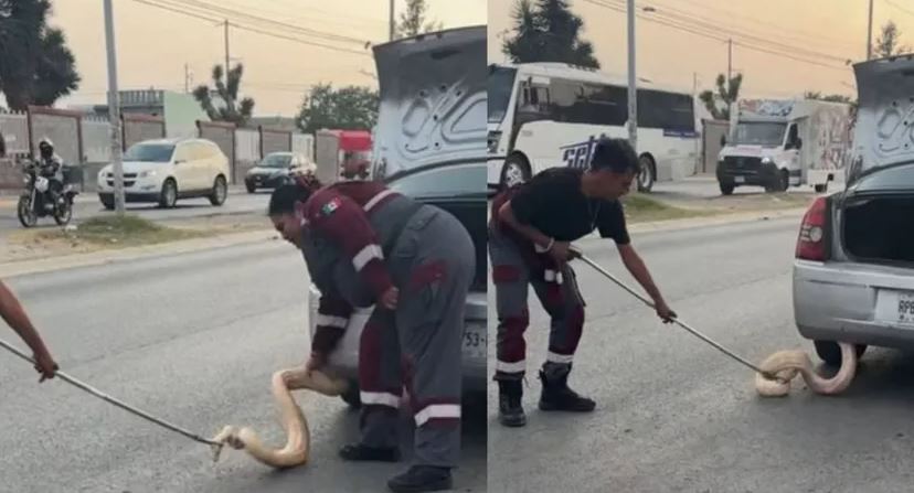 Elementos de Protección Civil de Zuazua acudieron al lugar y lograron asegurar al ejemplar sin poner en riesgo a la automovilista ni a los vecinos del sector. De acuerdo con los brigadistas, la serpiente pitón, pese a su tamaño, no mostró agresividad, lo que facilitó su captura y resguardo inmediato.