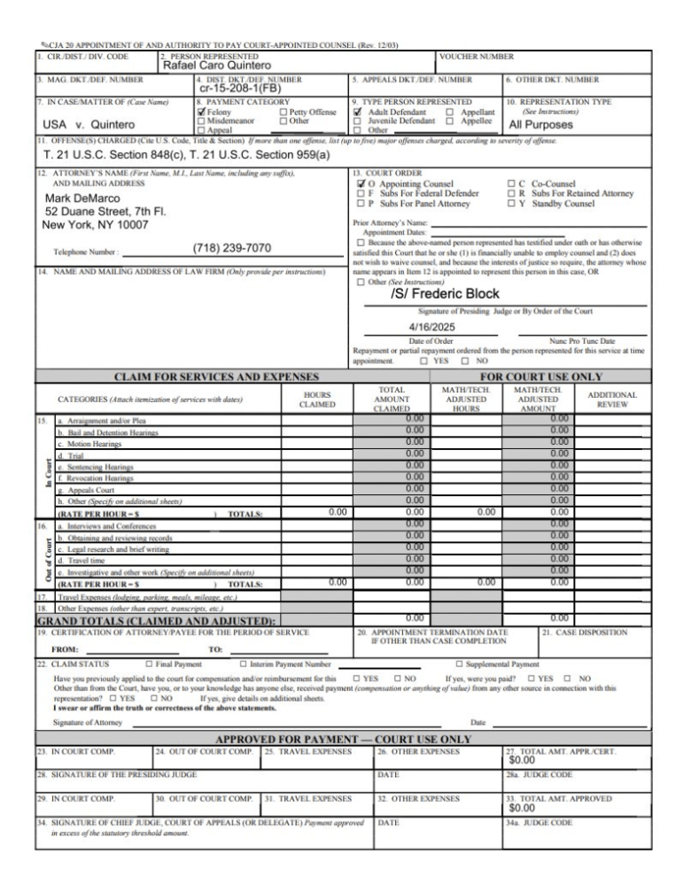 DeMarco se suma a la abogada Elizabeth Macedonio, asignada por el juez Block el pasado 26 de marzo como asesora especial, en vista de que Caro Quintero puede ser condenado a muerte por los delitos que le son imputados.
